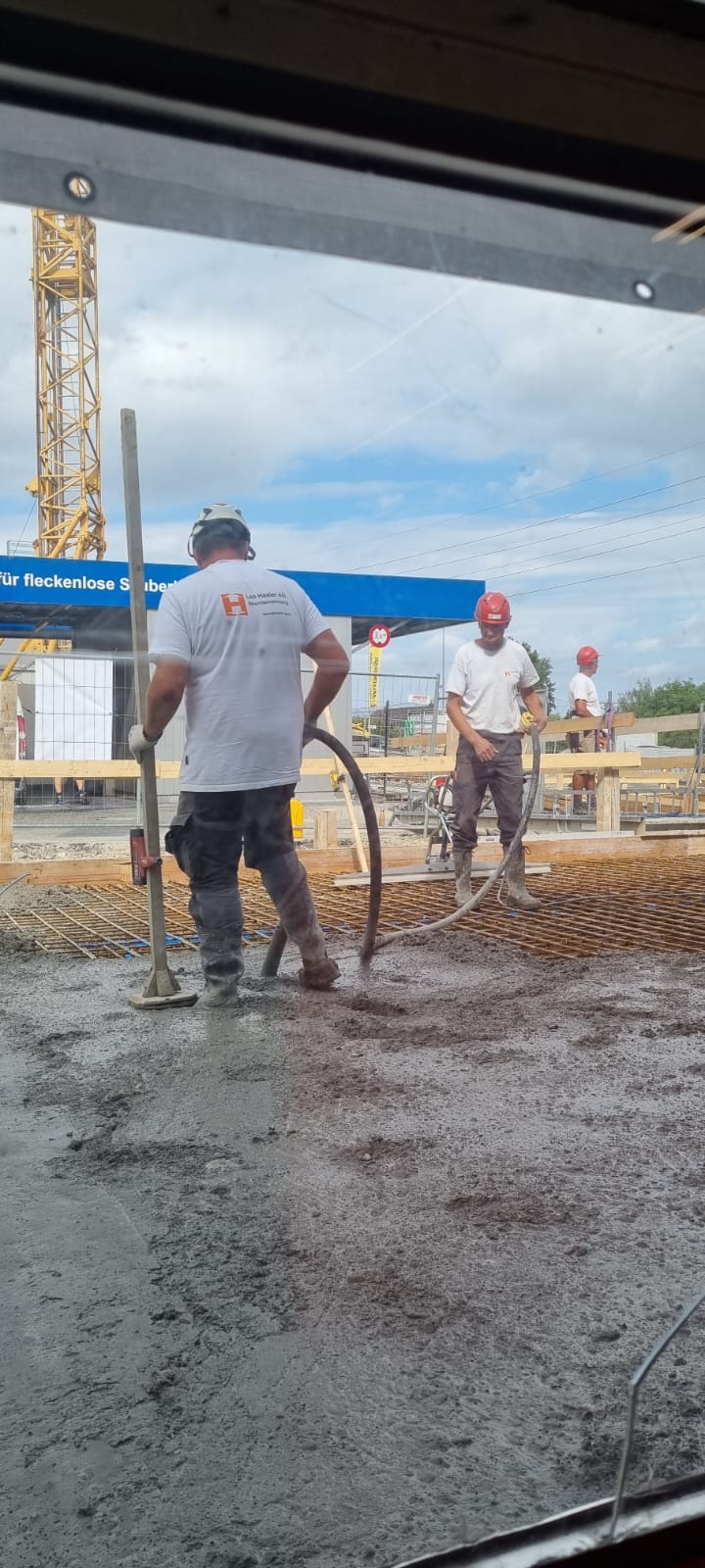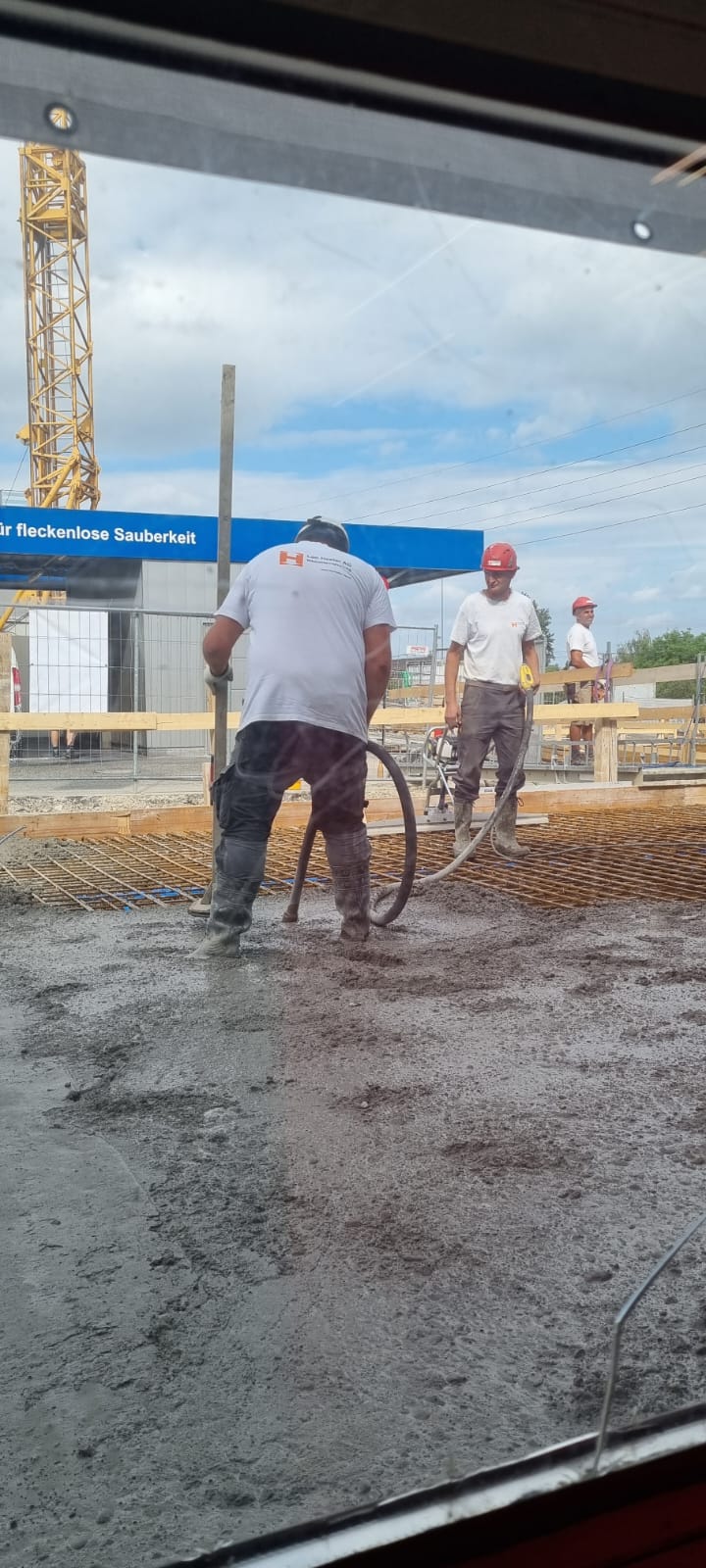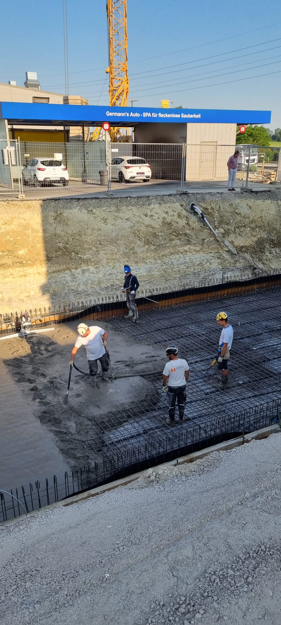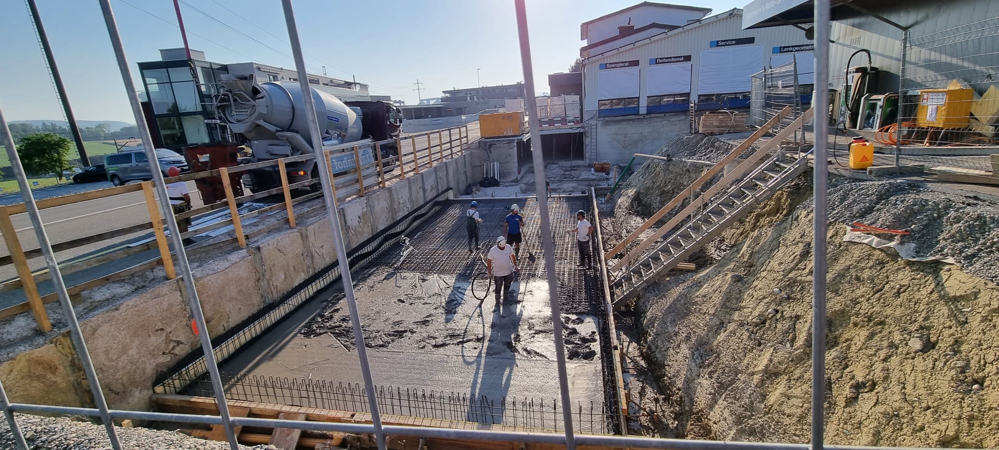 Die Baggerarbeiten wurden abgeschlossen und wir sagten tschüss zum Bagger-Team und danke für die gute Arbeit! Nach den Ausmessungsarbeiten wurden die Armierungseisen verlegt. Dann wurde der Monobeton angeliefert und zu unserem neuen Kellerboden gegossen. Cool, wir können bald schon auf dem Boden unseres neuen Pneu-Hotels stehen!