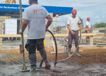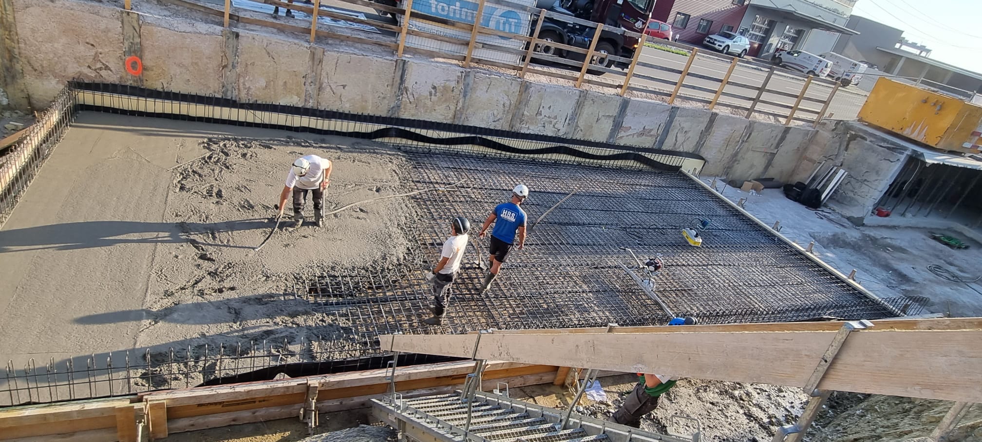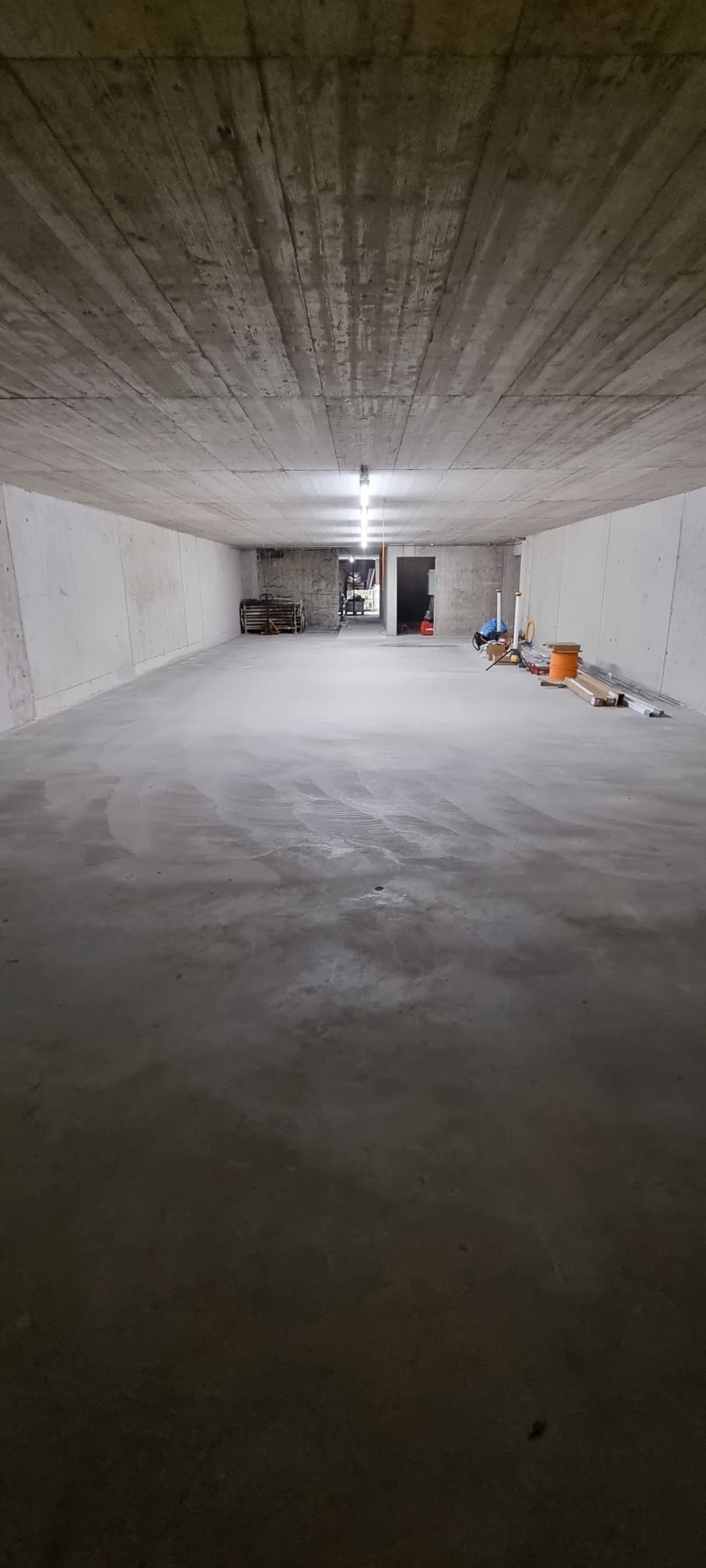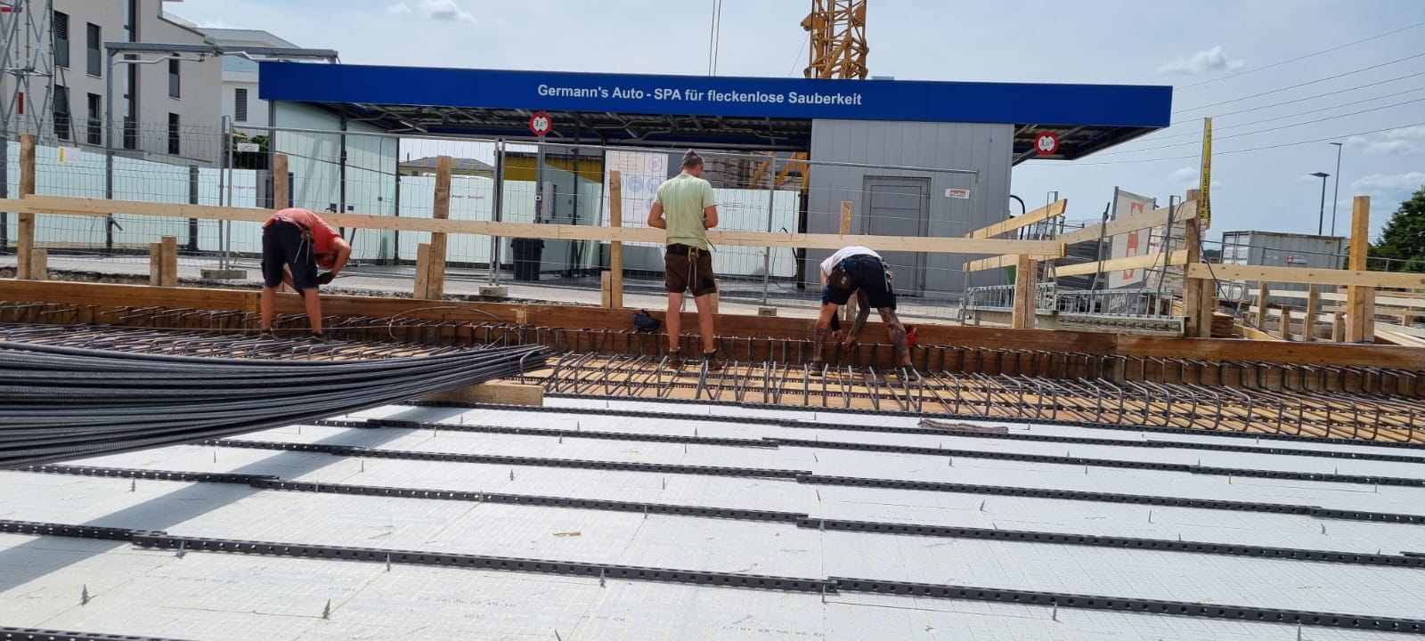 Die Baggerarbeiten wurden abgeschlossen und wir sagten tschüss zum Bagger-Team und danke für die gute Arbeit! Nach den Ausmessungsarbeiten wurden die Armierungseisen verlegt. Dann wurde der Monobeton angeliefert und zu unserem neuen Kellerboden gegossen. Cool, wir können bald schon auf dem Boden unseres neuen Pneu-Hotels stehen!