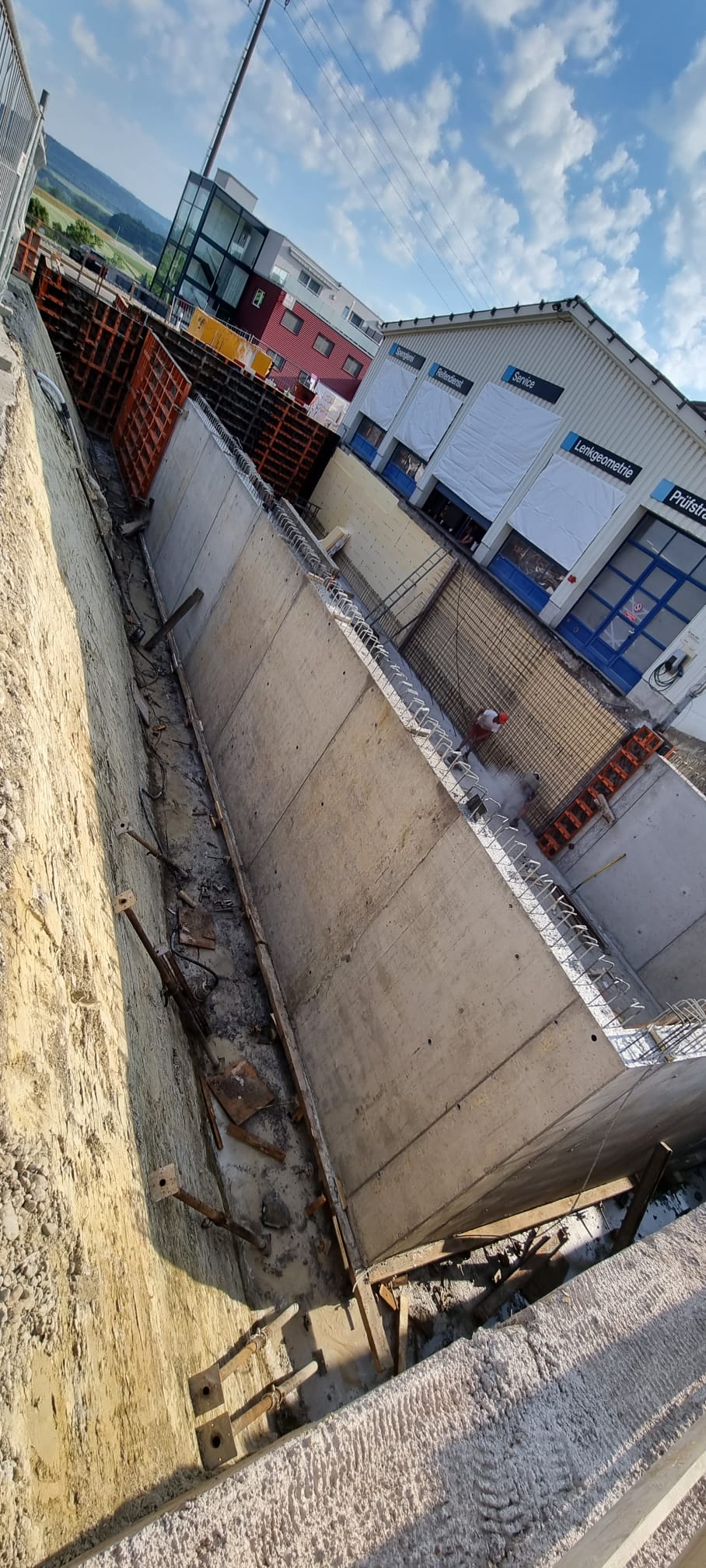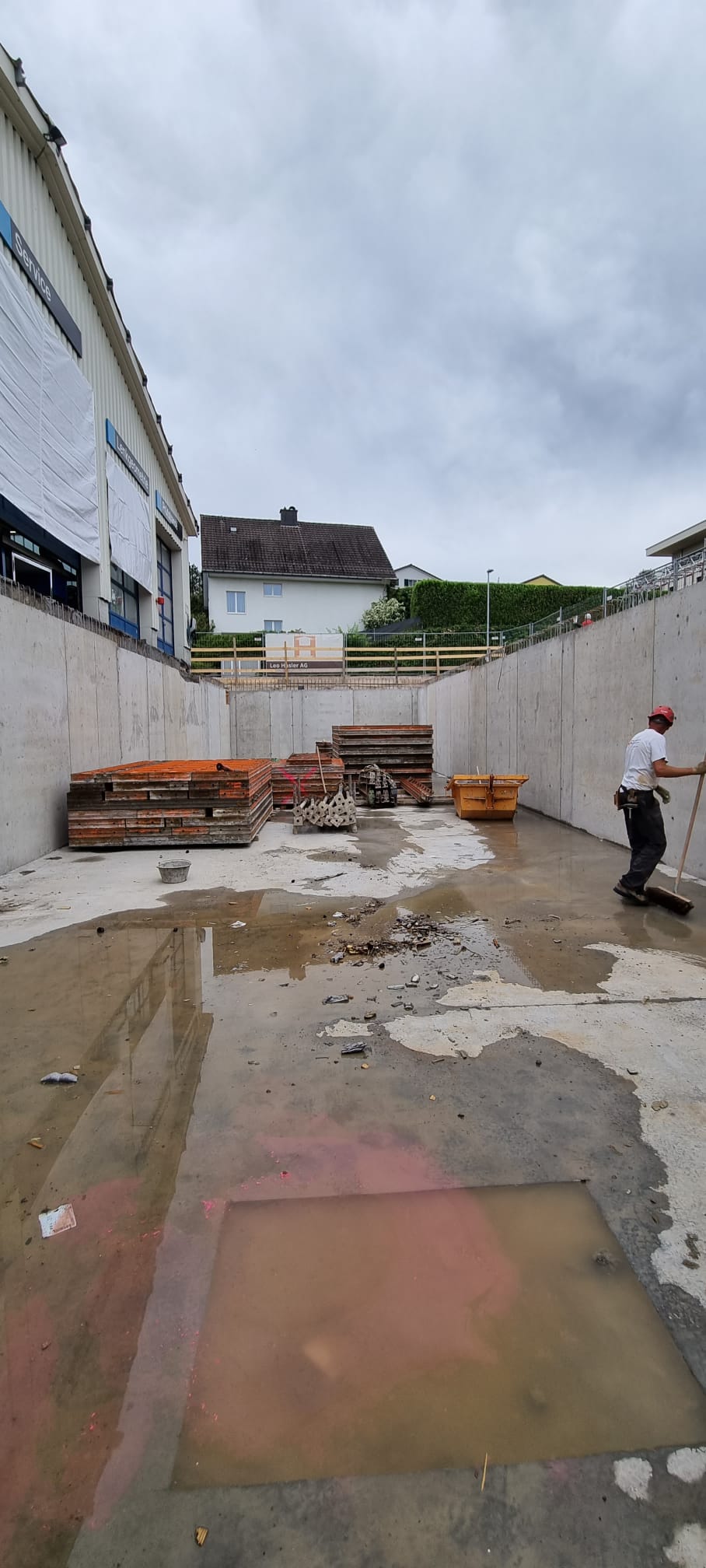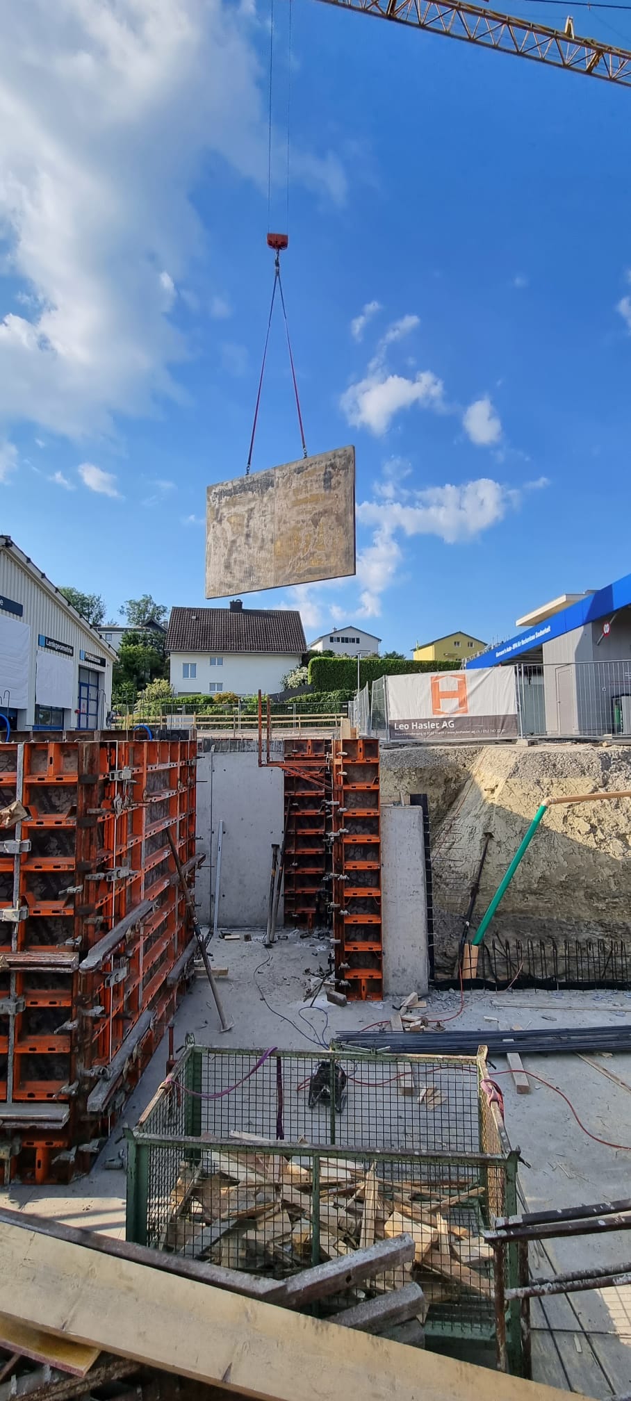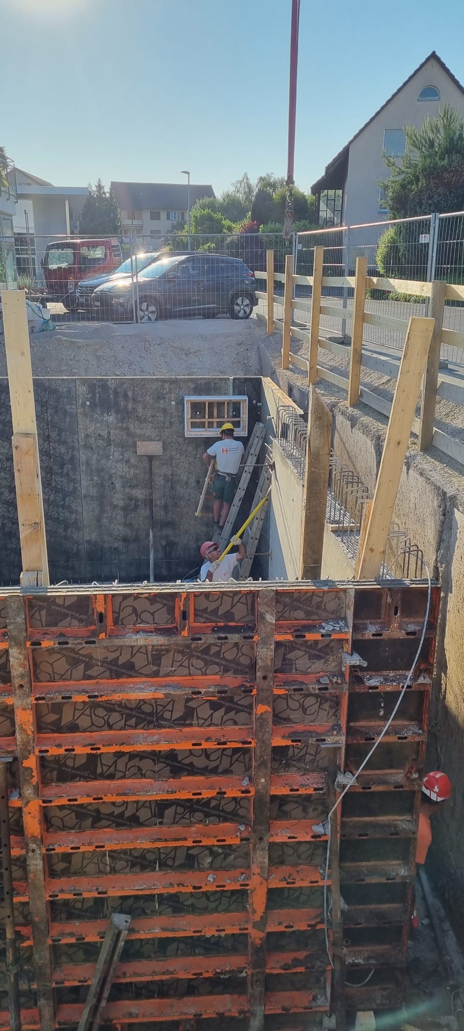 Bei heissen Temperaturen entstand mit viel Einsatz und Fachwissen die Decke unseres neuen Kellers. Anschliessend wurden die Seitenwände abgedichtet und bereits wieder hinterfüllt. Ebenfalls wurden verschiedene Einlagearbeiten für Strom-, Lüftung- und Sanitärinstallationen ausgeführt.