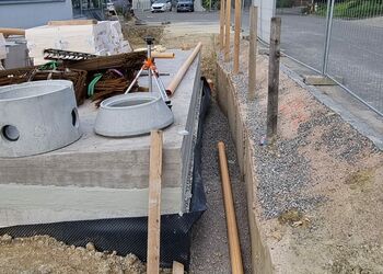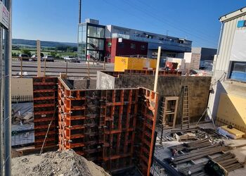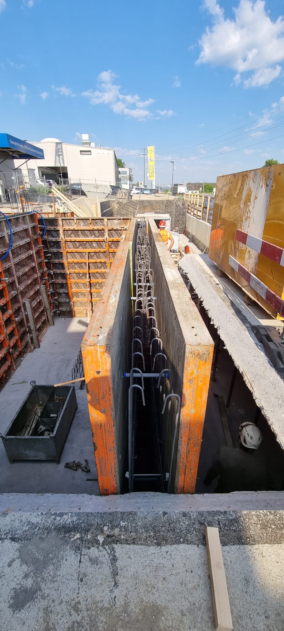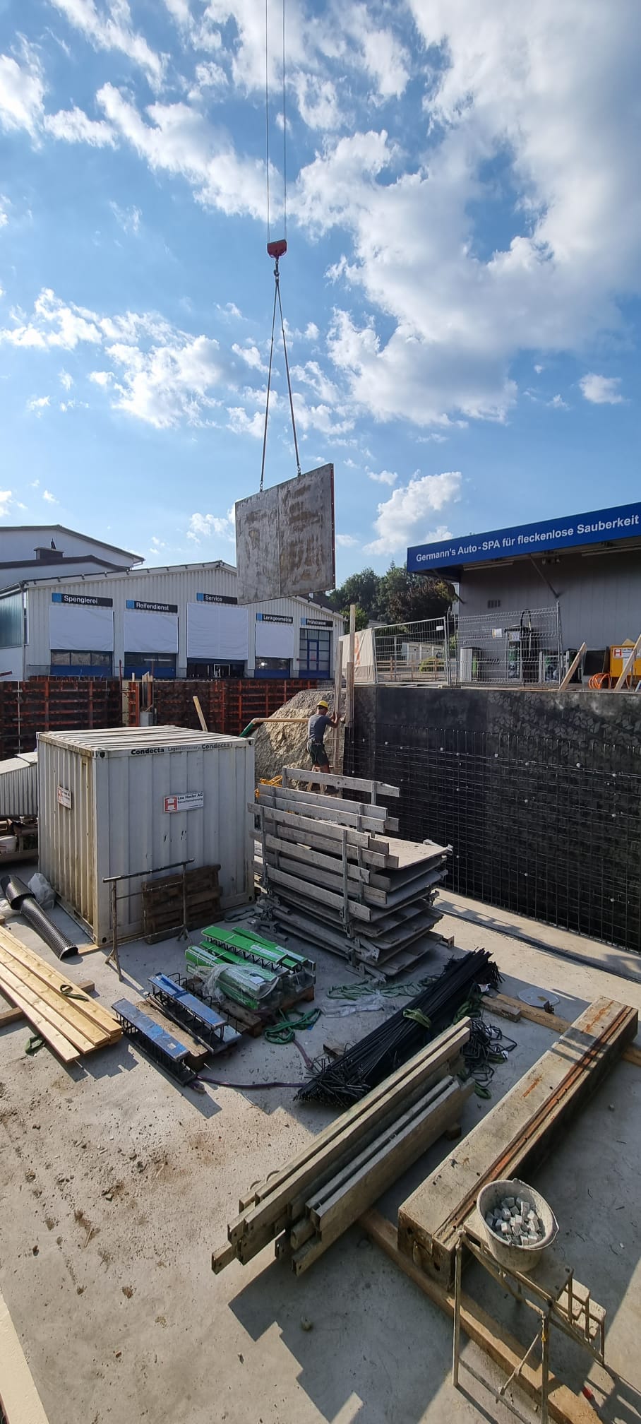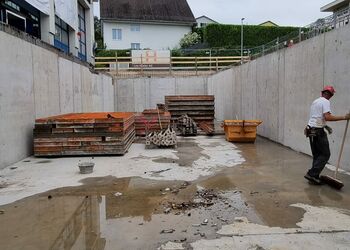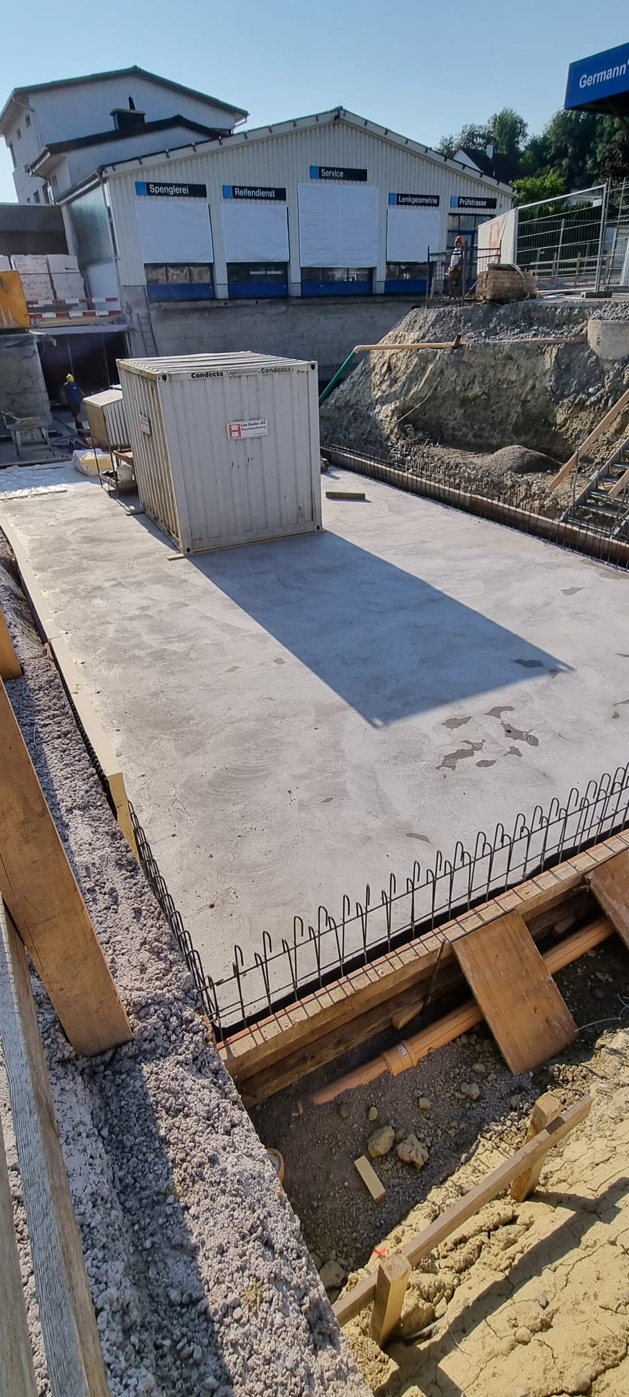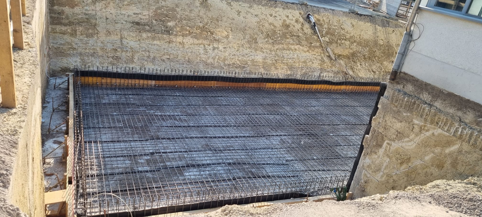 Bei heissen Temperaturen entstand mit viel Einsatz und Fachwissen die Decke unseres neuen Kellers. Anschliessend wurden die Seitenwände abgedichtet und bereits wieder hinterfüllt. Ebenfalls wurden verschiedene Einlagearbeiten für Strom-, Lüftung- und Sanitärinstallationen ausgeführt.