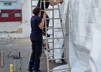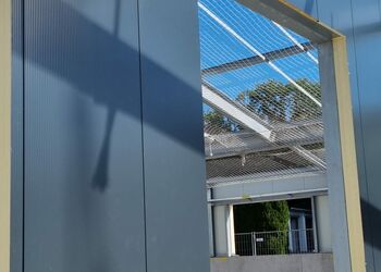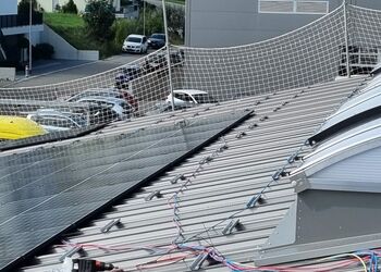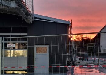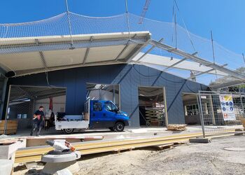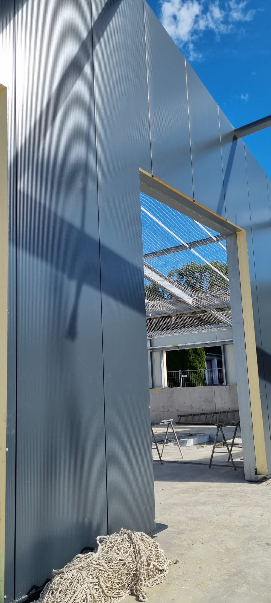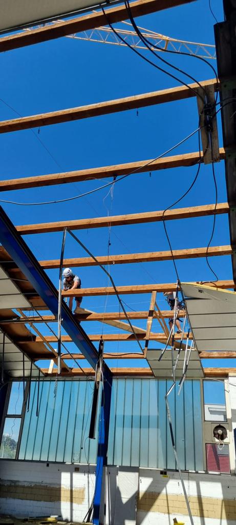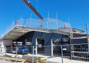 Zur Absturzsicherung für den Aufbau des neuen Daches wurde ein riesiges Netz gespannt. Diese Woche wird der Neubau eingerüstet und bald beginnen die Montagearbeiten für das Dach. Unser Warenlift wurde geliefert und mit dessen Einbau wurde auch schon gestartet.