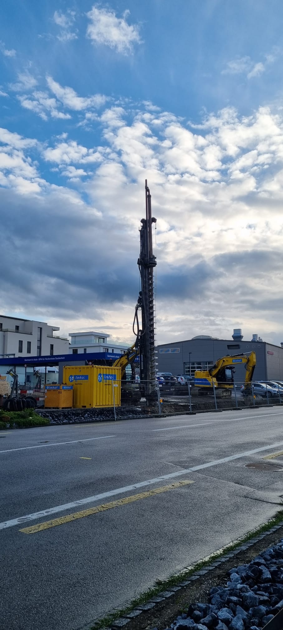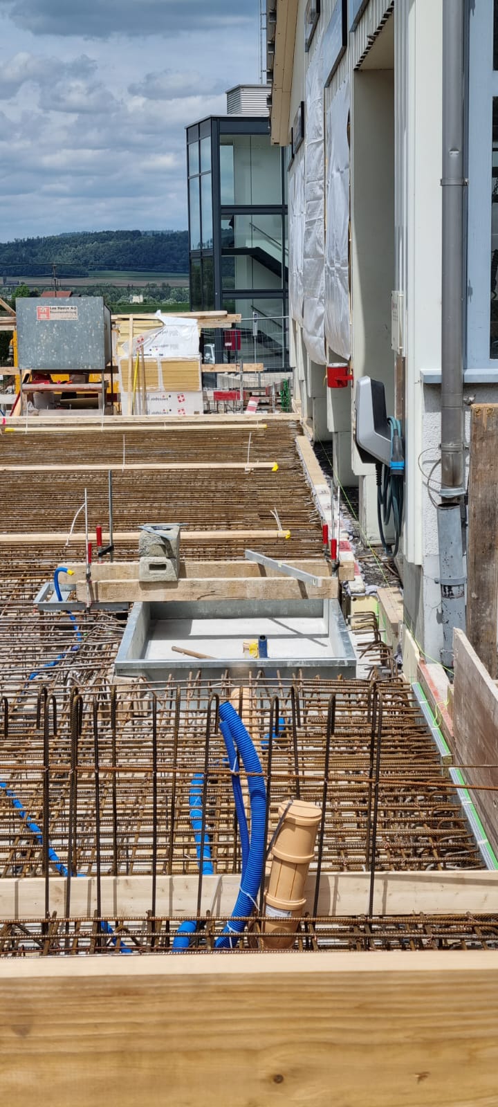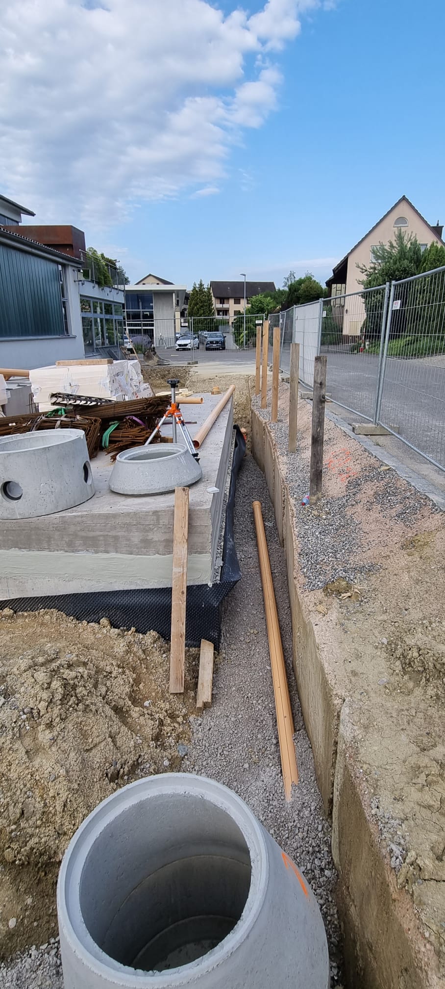 Die Bauarbeiten gehen in grossen Schritten voran. Die Vorinstallationen für die nachfolgenden drei Erdsondenbohrungen auf 280 m Tiefe sind abgeschlossen.
