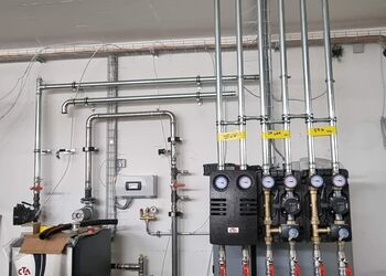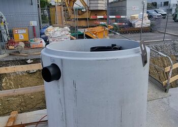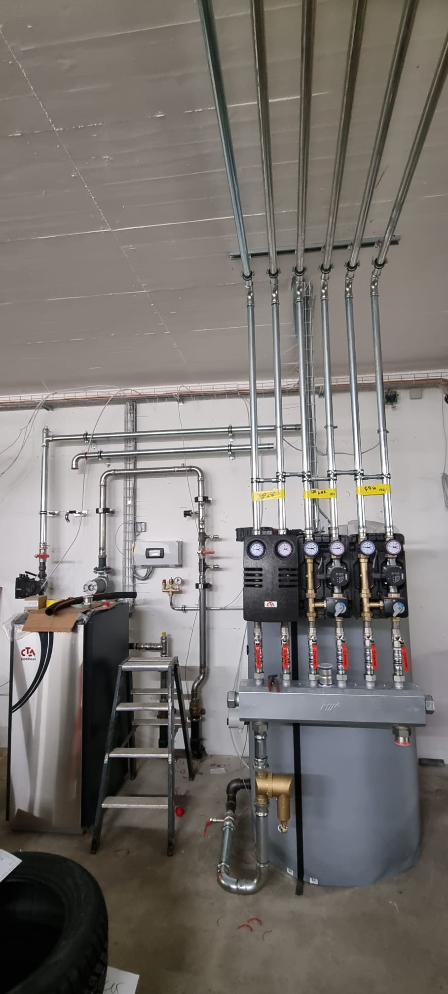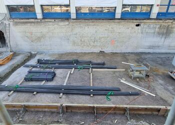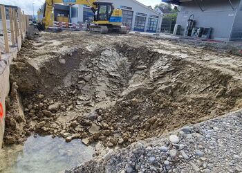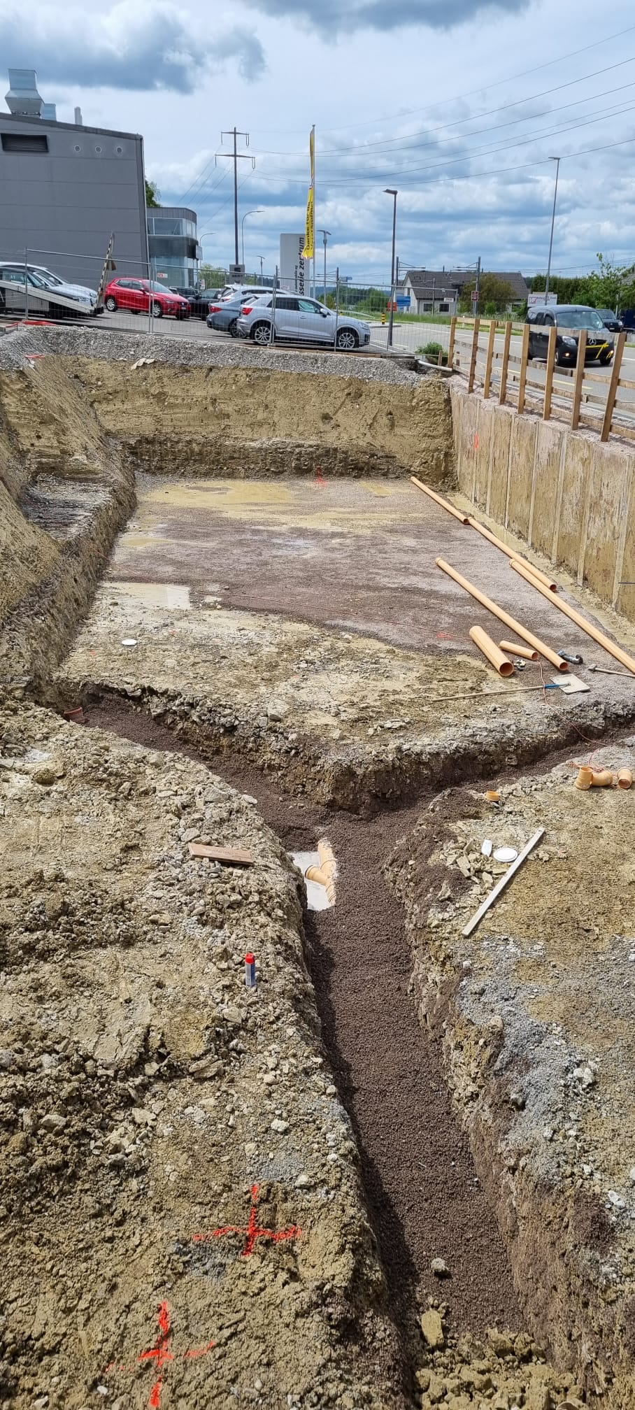 Die Bauarbeiten gehen in grossen Schritten voran. Die Vorinstallationen für die nachfolgenden drei Erdsondenbohrungen auf 280 m Tiefe sind abgeschlossen.