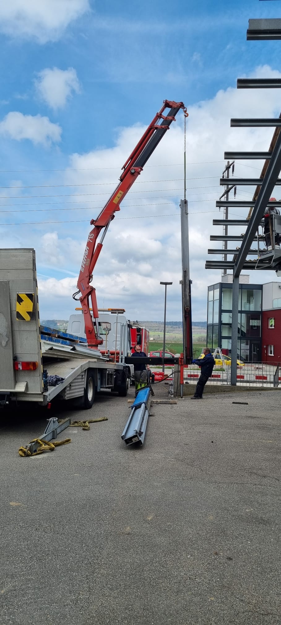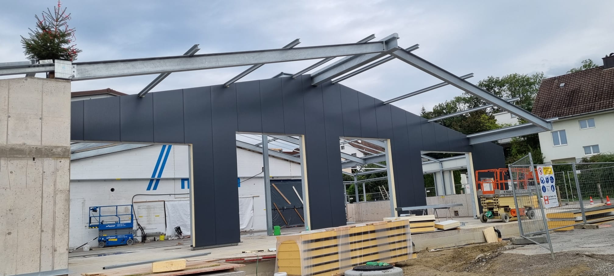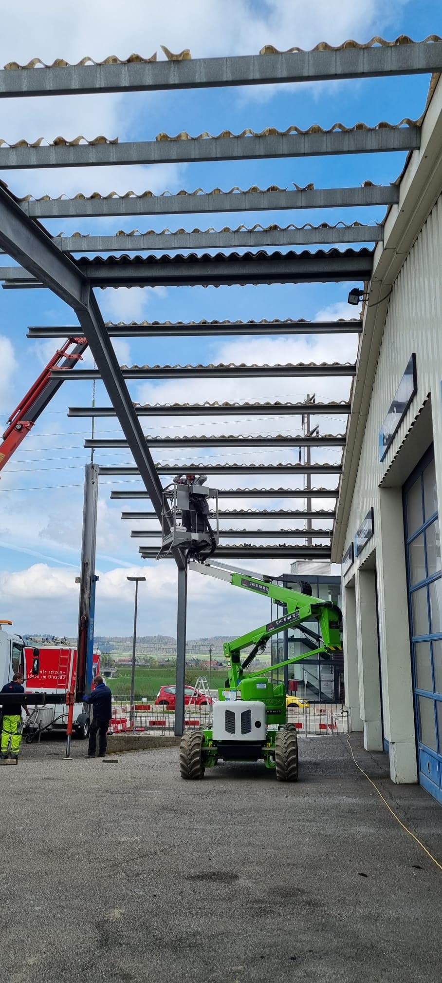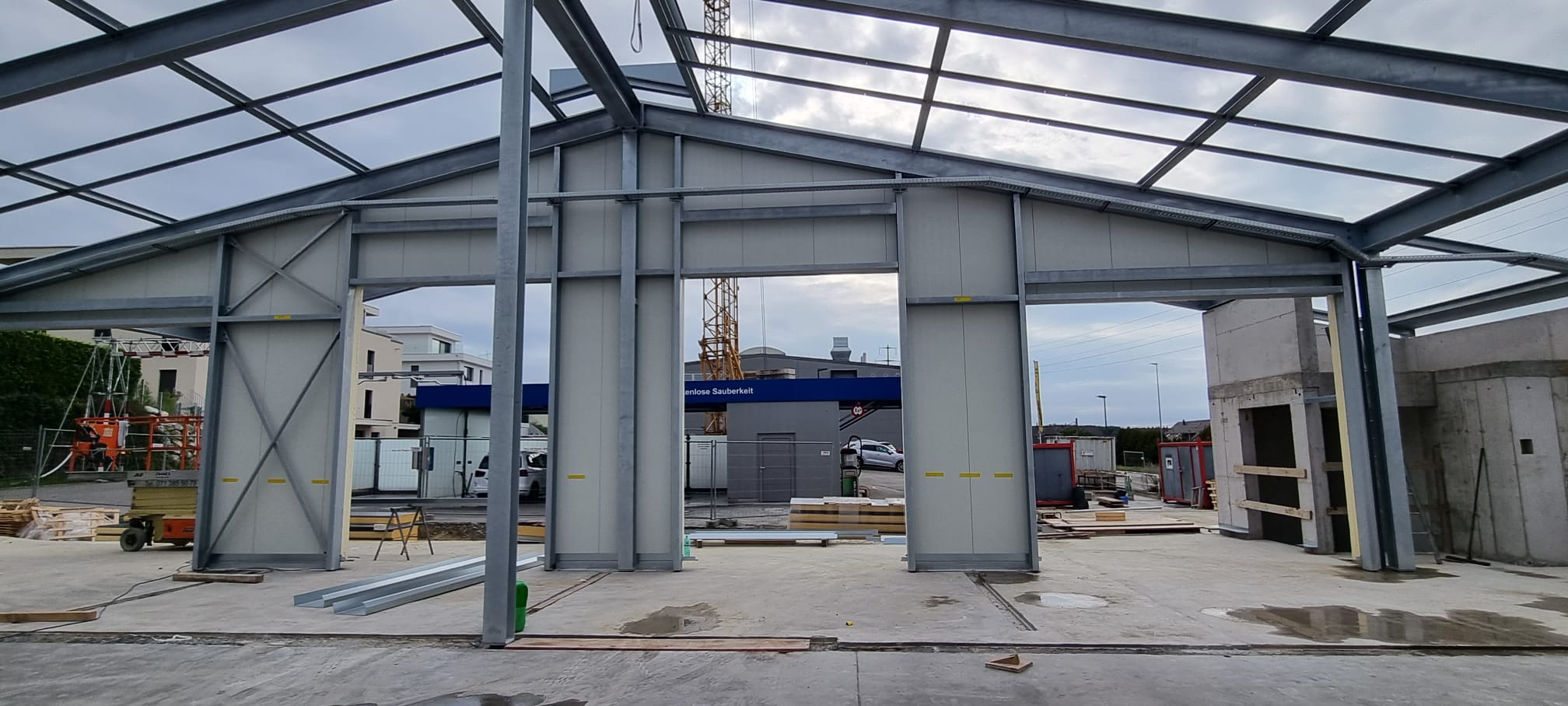 Ein ganz spezieller Moment war, als die alte Werkstatt komplett weg war. Man konnte nur noch erahnen und sich erinnern, wie es mal ausgesehen hat. Dann begannen die Vorbereitungen für den neuen Stahlbau. Ein Sattelschlepper lieferte die riesigen Stahlträger. Stück um Stück entstand der Stahlbau für unsere neue Werkstatt. Die nächste grosse Lieferung waren die Fassaden-Elemente. Die Teile werden feinsäuberlich zugeschnitten, eingepasst und angebracht. Die Elektriker sind dabei die Elektroinstallationen vorzubereiten und es wurden Elektro-Trasses verbaut.