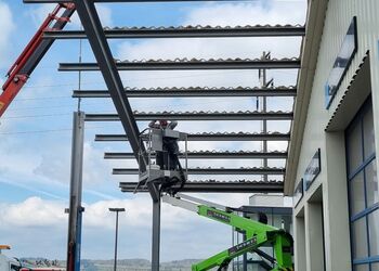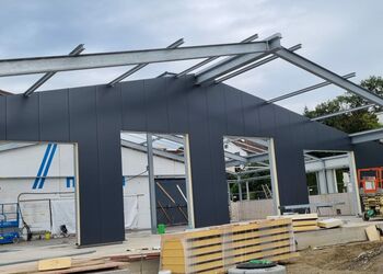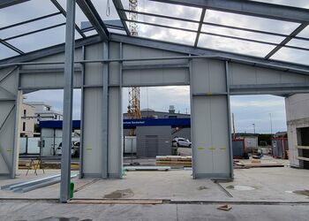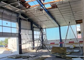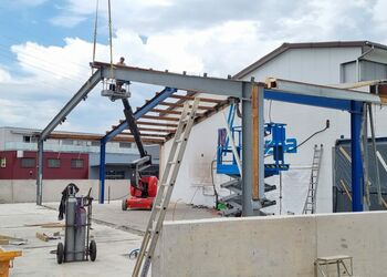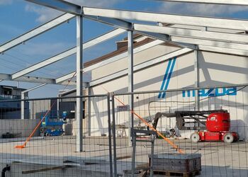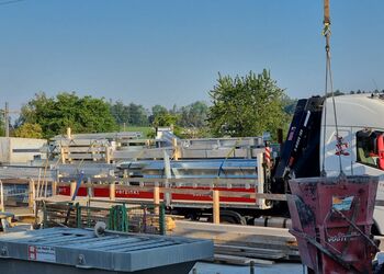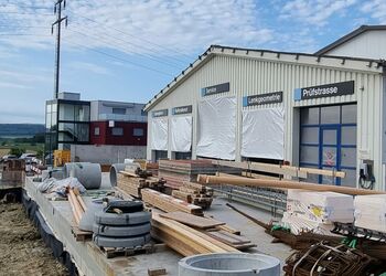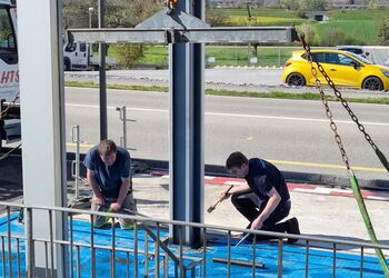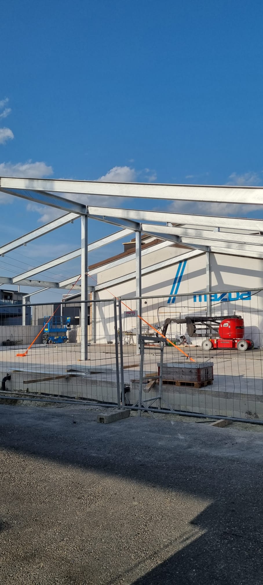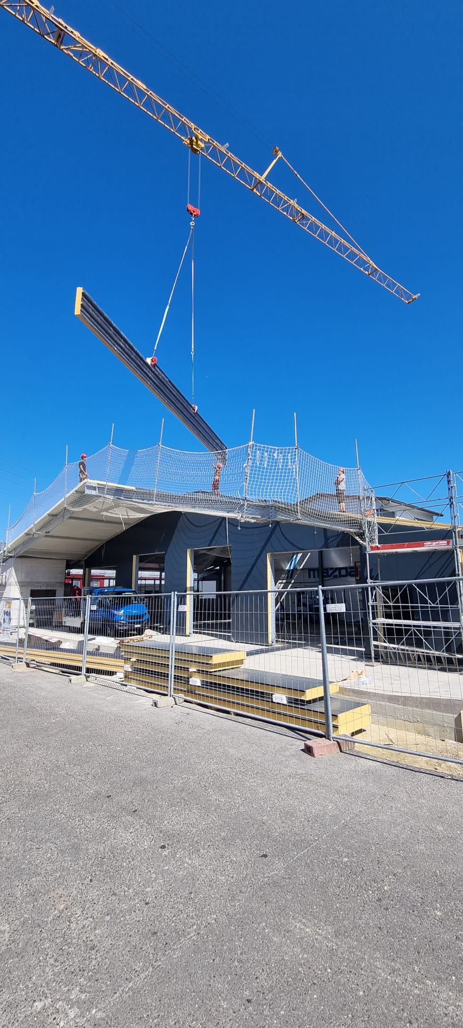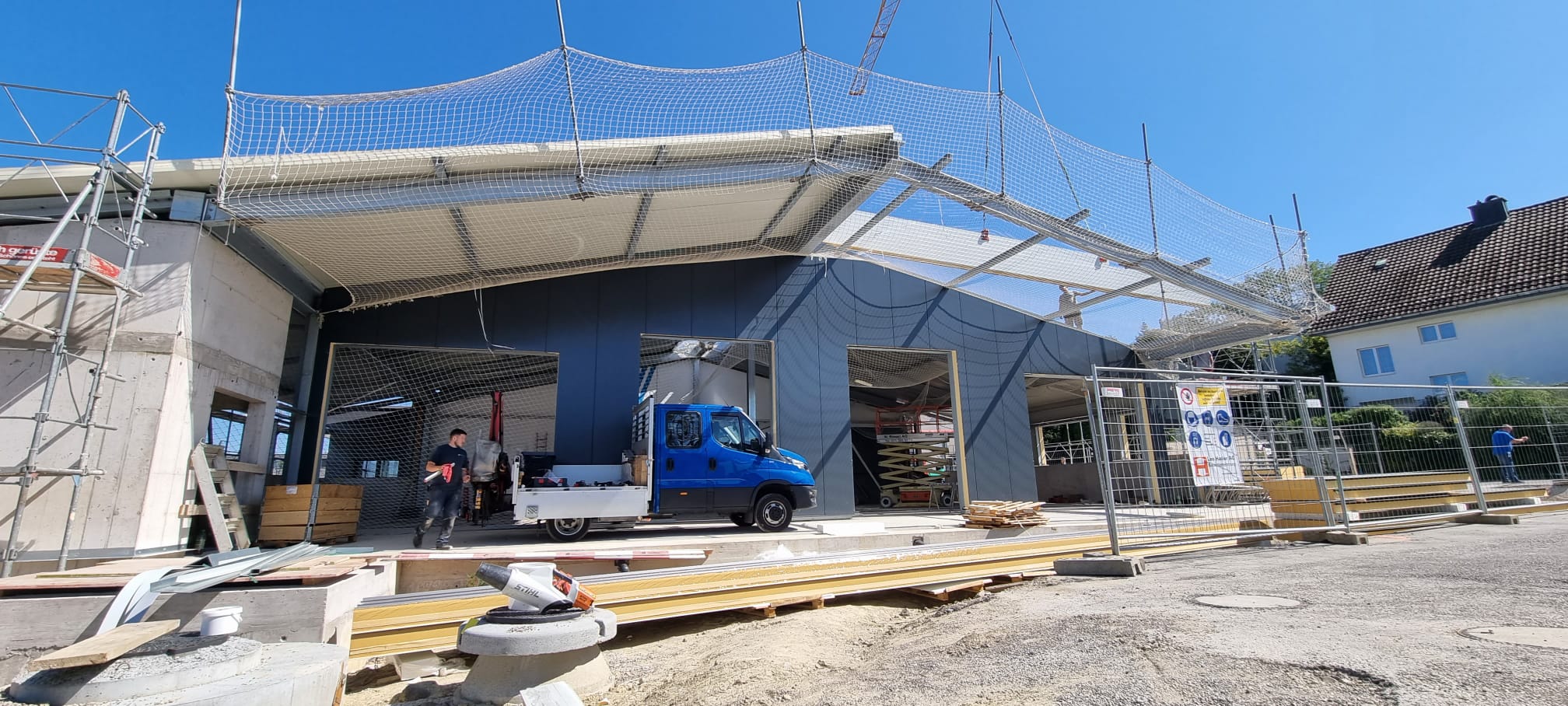 Ein ganz spezieller Moment war, als die alte Werkstatt komplett weg war. Man konnte nur noch erahnen und sich erinnern, wie es mal ausgesehen hat. Dann begannen die Vorbereitungen für den neuen Stahlbau. Ein Sattelschlepper lieferte die riesigen Stahlträger. Stück um Stück entstand der Stahlbau für unsere neue Werkstatt. Die nächste grosse Lieferung waren die Fassaden-Elemente. Die Teile werden feinsäuberlich zugeschnitten, eingepasst und angebracht. Die Elektriker sind dabei die Elektroinstallationen vorzubereiten und es wurden Elektro-Trasses verbaut.