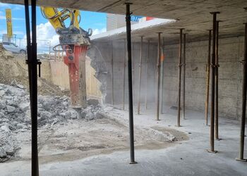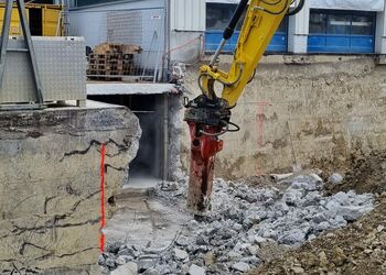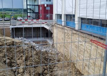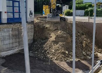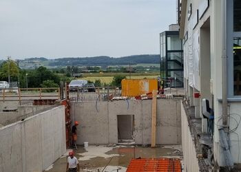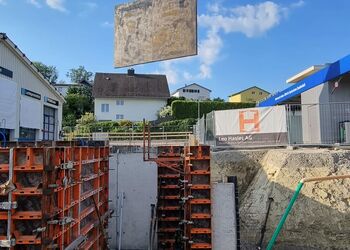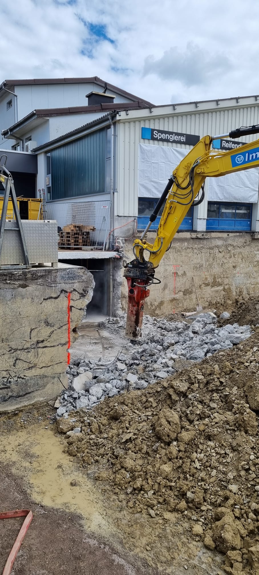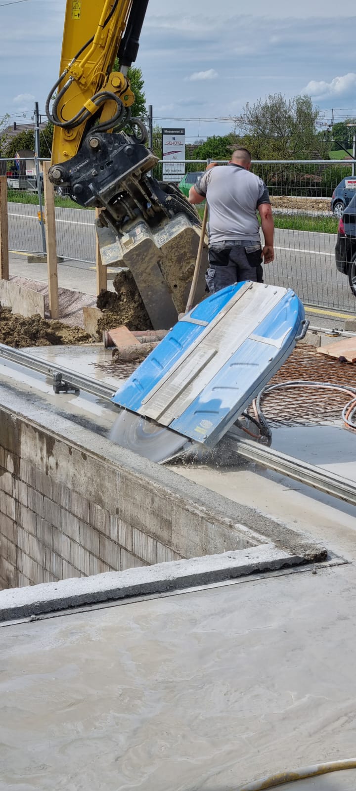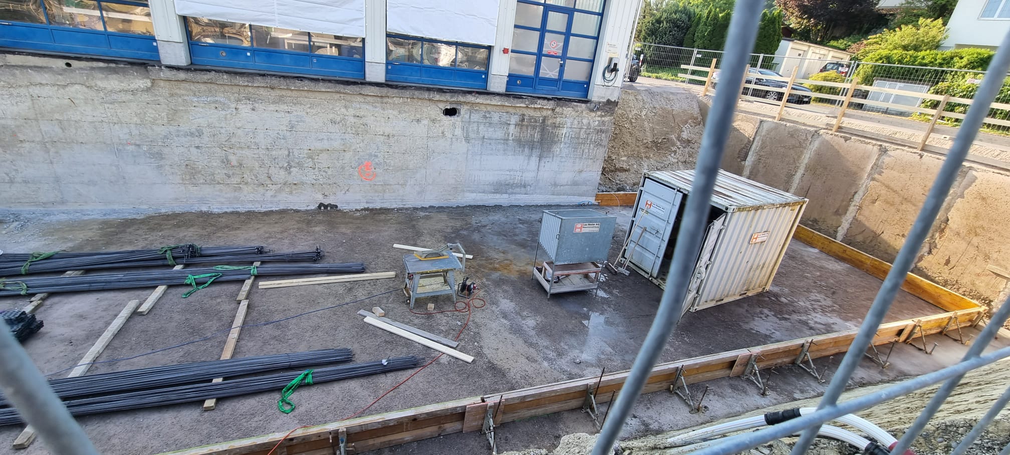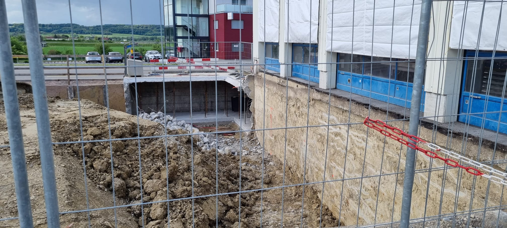 In der vergangenen Woche wurde im Aussenbereich die Absicherung gegen die Kantonsstrasse fertiggestellt. Dann wurde die Betondecke vom alten Keller geschnitten. Am Freitag konnte mit den Aushubarbeiten für den neuen Keller begonnen werden.