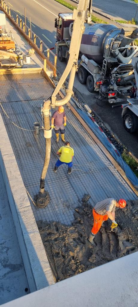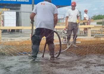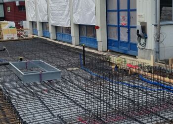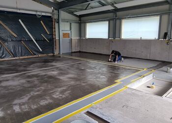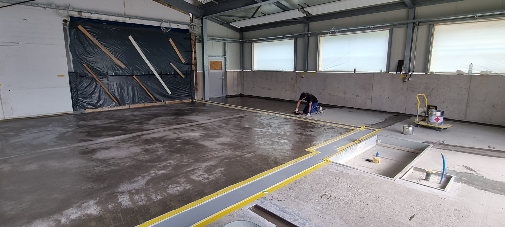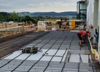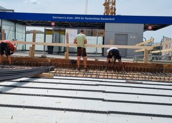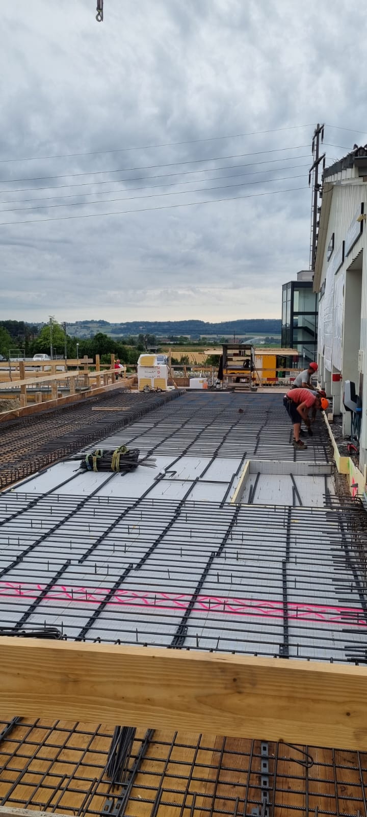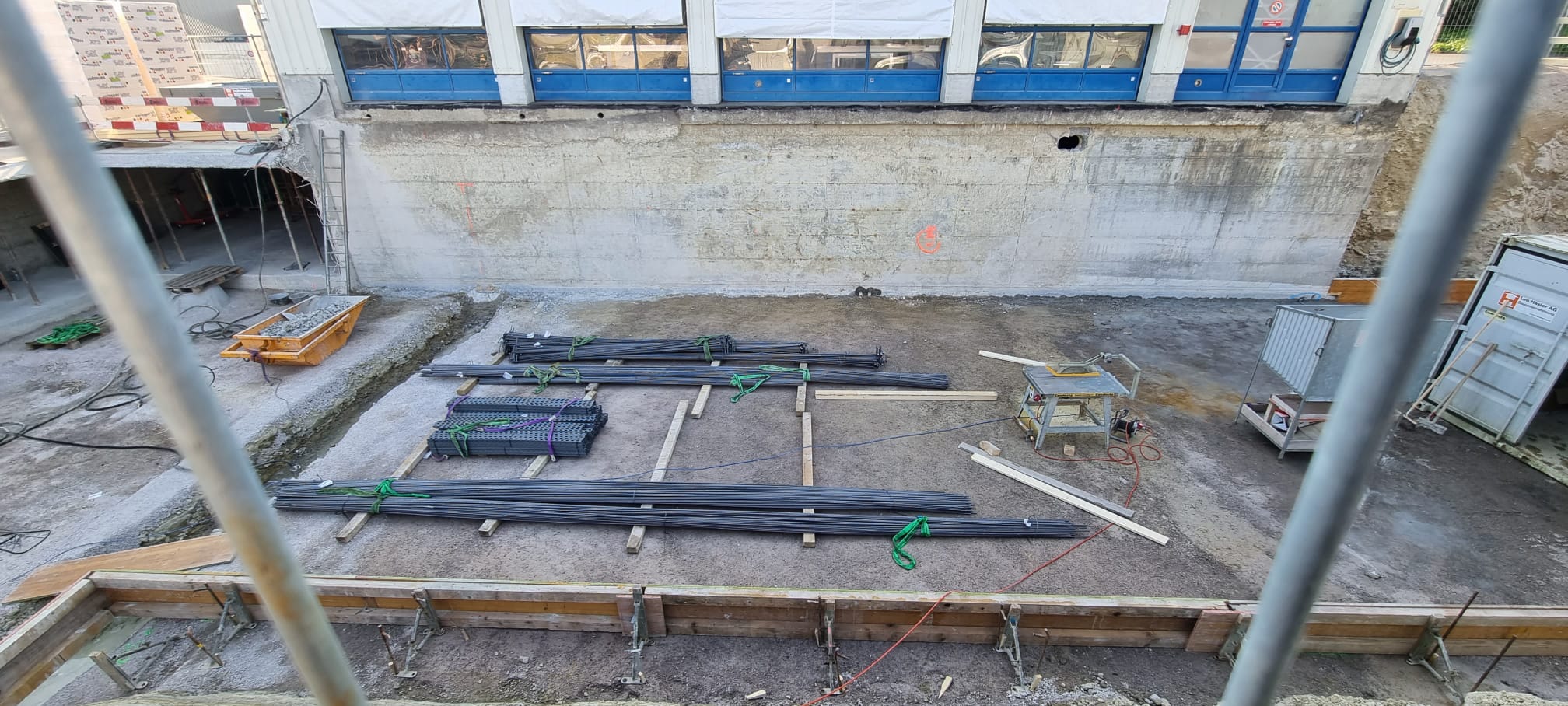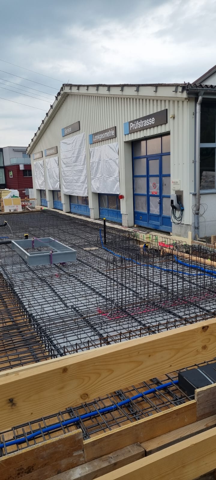 Schalltafeln wurden verlegt, Isolation angebracht, viel Eisen verlegt, Aussparungen für den geplanten Bremsprüfstand wurden verstärkt, Leitungen wurden berücksichtigt und dann kam der Beton.
