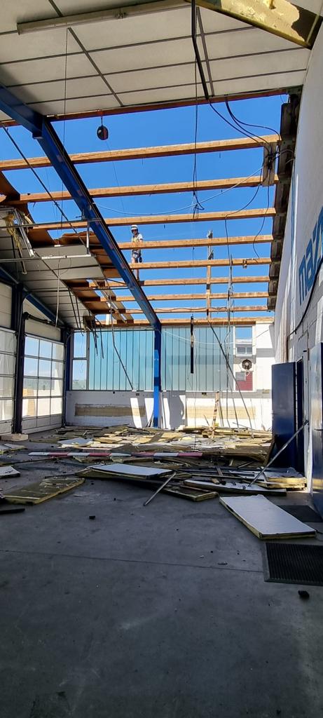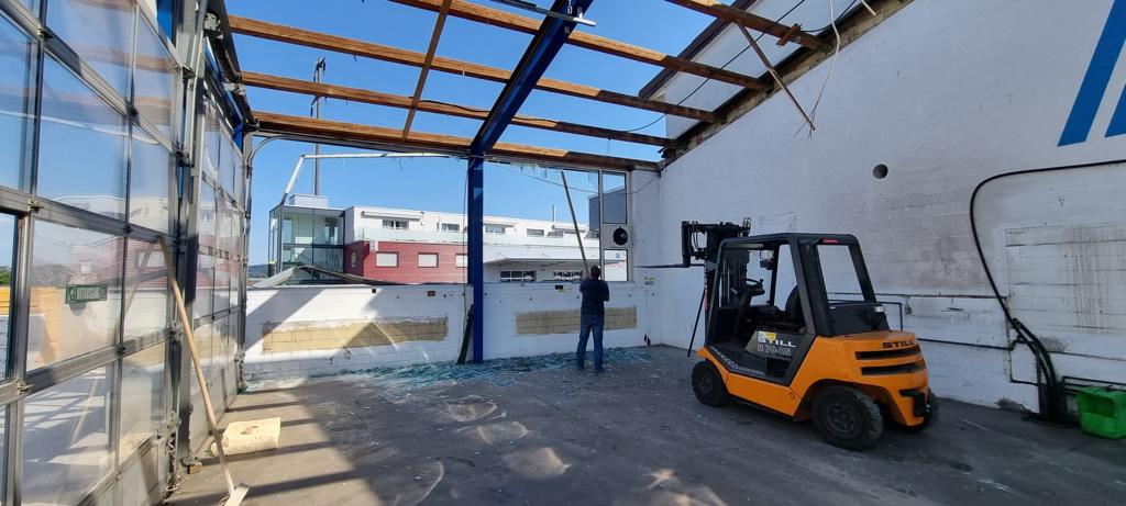 Eine Besonderheit in dieser Bauetappe ist wohl der Abbruch unseres Herzstückes – der Werkstatt. Zuerst wurde sie komplett ausgeräumt. Die Lifte wurden fachmännisch demontiert und anschliessend wurden sie eingelagert.