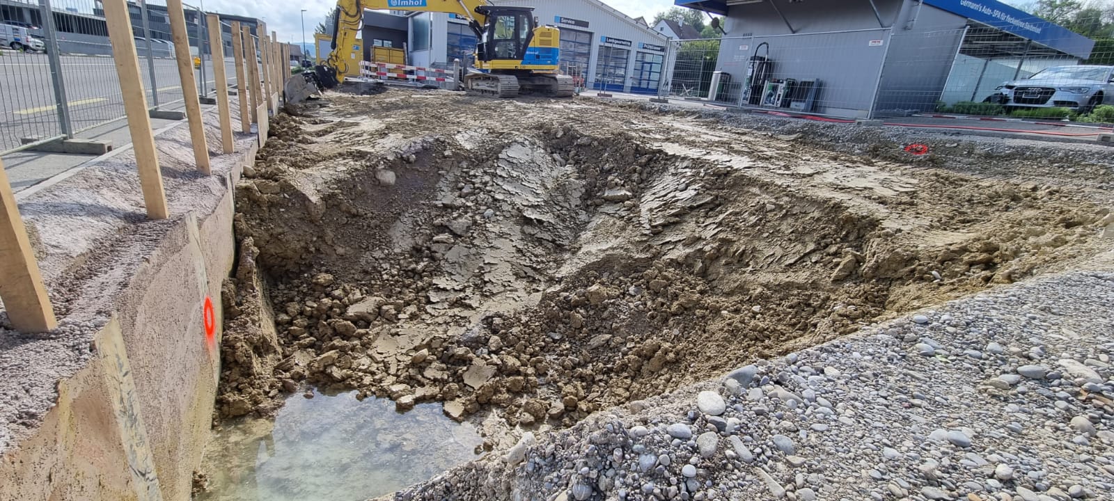 Grüezi, schön dass Sie unseren Bau-Blog wieder besuchen. Es ist kaum zu fassen, wie gross die Baugrube mittlerweile geworden ist. Entlang der Quartierstrasse wurde eine Pfahlwand erstellt, damit nichts abrutschen kann.